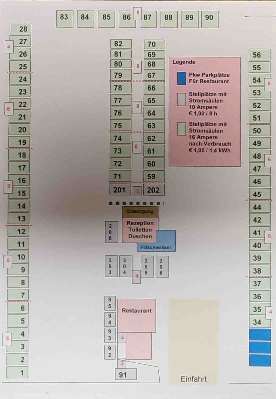 19,00 € pro Wohnmobil, inkl. WIFI, Sanitär, Entsorgung, 4,10 € Kurtaxe, 0,90 € Umweltpauschale