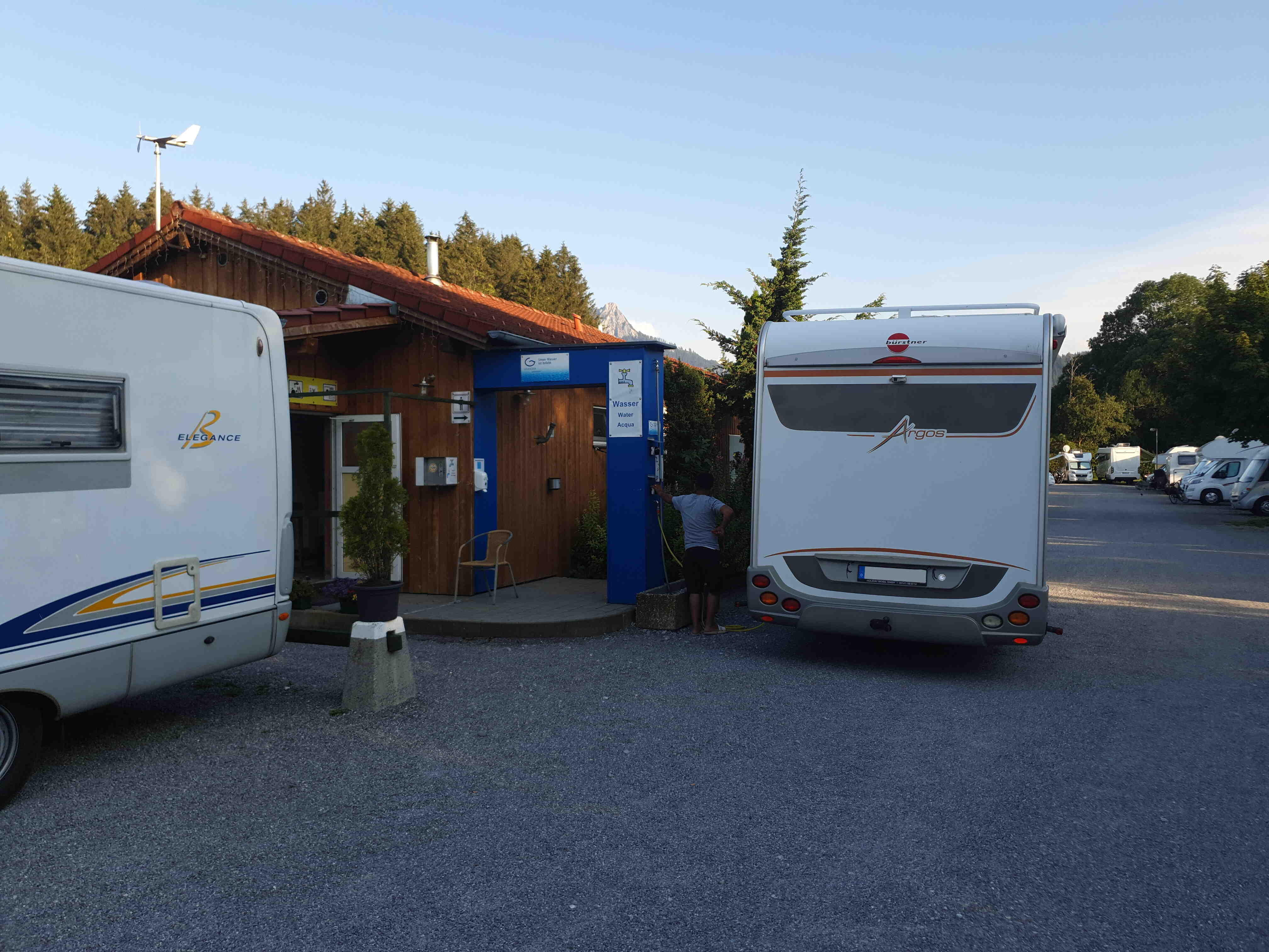 Es bietet sich Ihnen die Möglichkeit, Ihr Wohnmobil mit frischem Trinkwasser für die Weiterfahrt vorzubereiten. Außerdem stehen Ihnen in der Waschküche Waschmaschinen und Trockner zur Verfügung, sowie Waschbecken zum Reinigen von Geschirr.